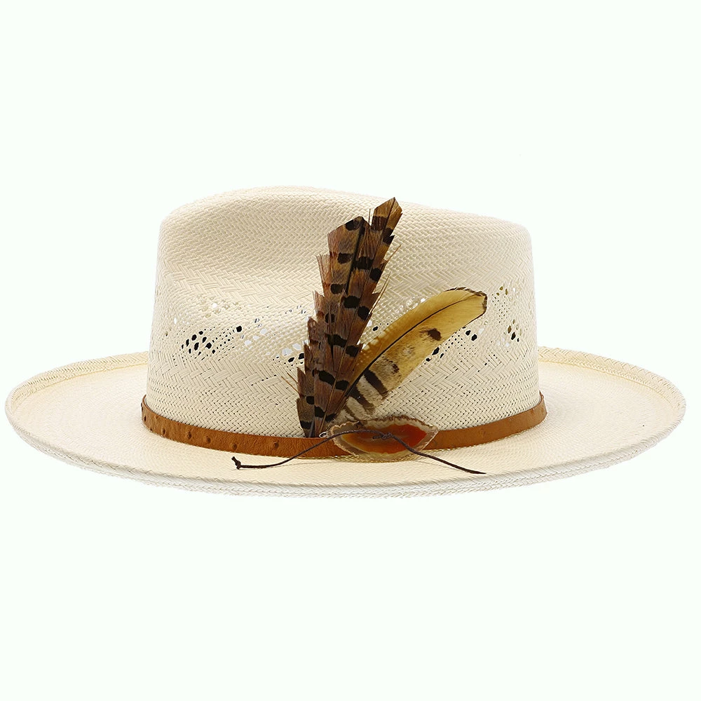 Part of the newest addition to Stetson’s Seeker Collection, the Andromeda brings out a western, organic flare to your style. Made from 100% shantung straw, this hat has a more porous weave, making it breathable and perfect for outdoors. The top features a teardrop crown, pencil-curled, flexible brim, and a faux ostrich leather hat band wrapped around with brown, with striped feathers and a decorative piece of agate stone. The sweatband inside is made from DRI-LEX® technology, which is absorbent of moisture, making it an ideal hat for outdoor and summer season wear.