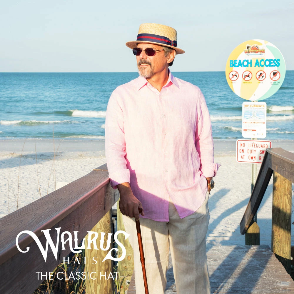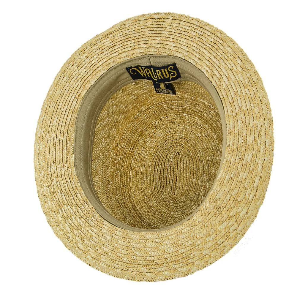 The Classic consists of a 100% wheat straw, features a flat crown, 1 7/8″ brim, two toned grosgrain ribbon hat band with stitched side bow, cotton sweatband and a Walrus Hats side pin.
