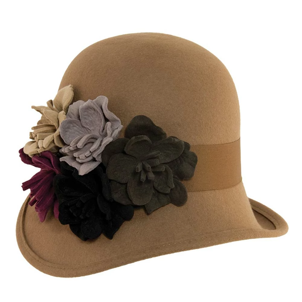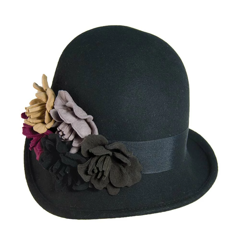 Wool Felt Cloche with Dimensional 1 3/4″ Brim | Grosgrain Band, Flowers | One Size Fits Most | Inner Drawstring Sweatband | Packable