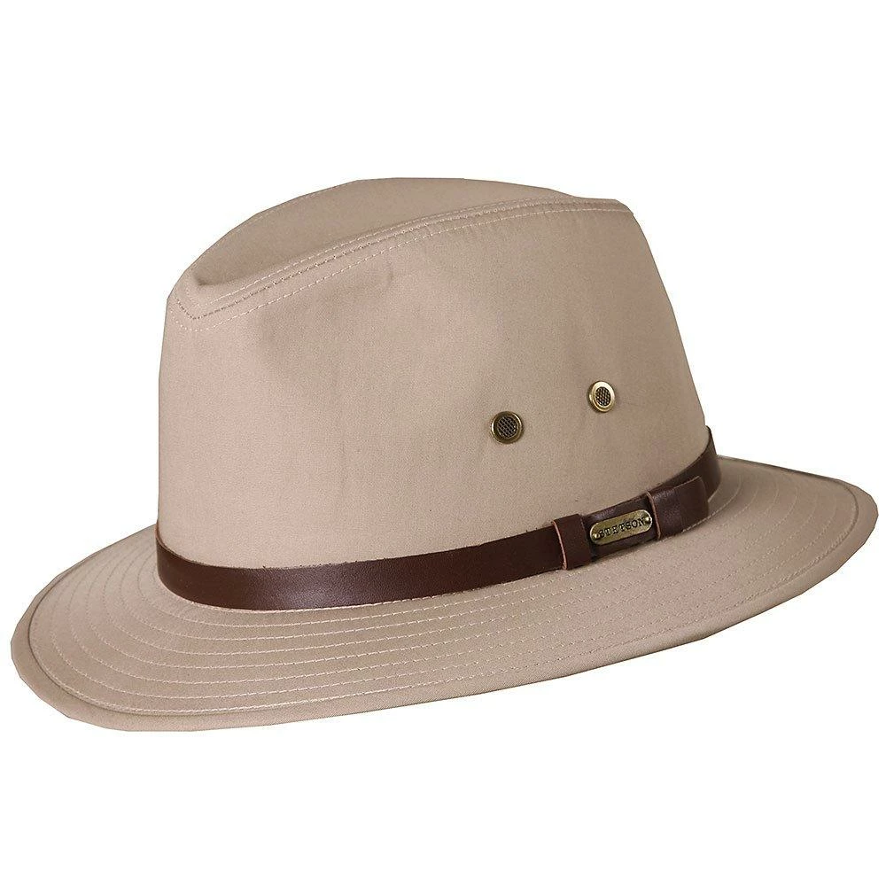 The water repellent cotton blend is ready to tackle the worst Mother Nature can deliver. The wide brim will cast a generous shadow, while the bronze eyelets are a super powerful one-two punch against the sun and humidity, ready to release any excess heat. An extra padded sweatband comes in handy when the battle intensifies. A leather hatband is a decidedly nice feature, paying respect to the mighty trekking history this hat descends from.