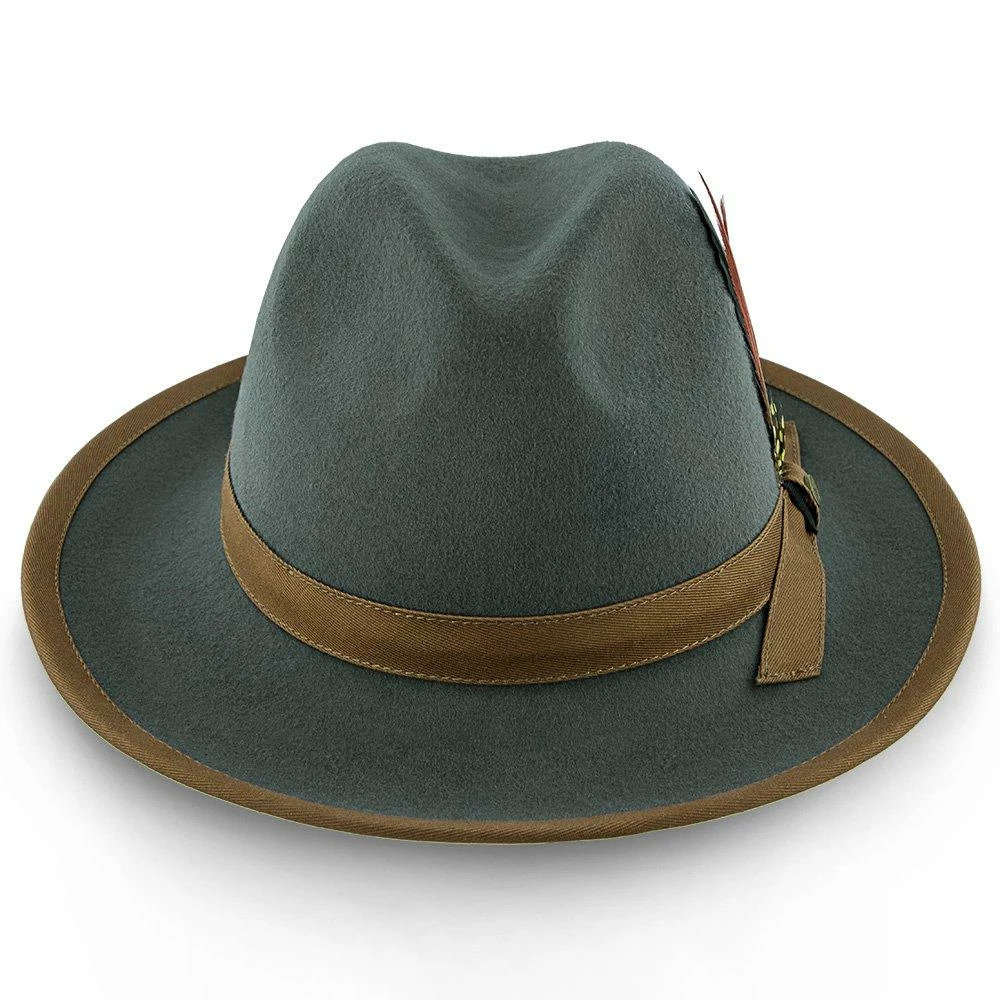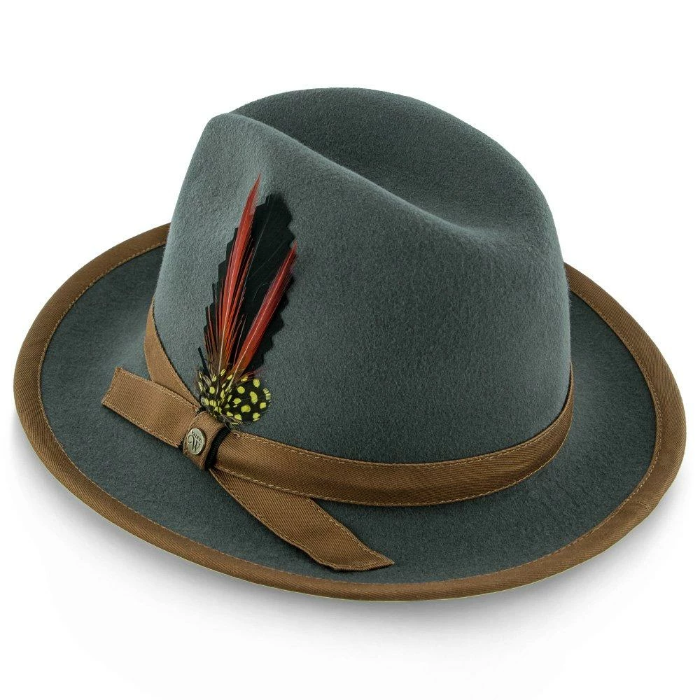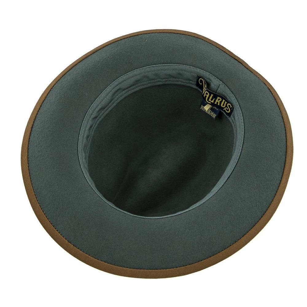The Pinnacle consists of a 100% Australian wool felt, features a center dent crown, 2 1/2″ brim, grosgrain ribbon cloth hat band, cotton sweatband, removable feather and Walrus Hats pin.