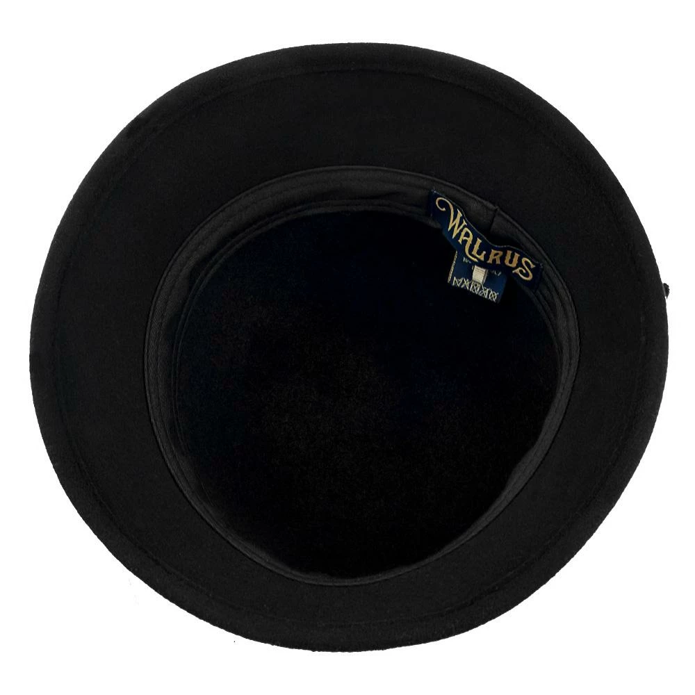 The Starling consists of a 100% Australian wool felt, features an open crown, 2″ brim, felt hat band, cotton sweatband, velvet hat band and a flower rhinestone jewel pendant.