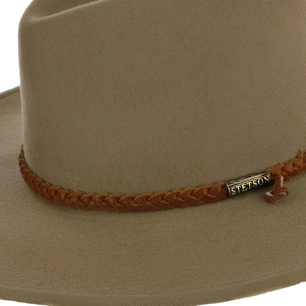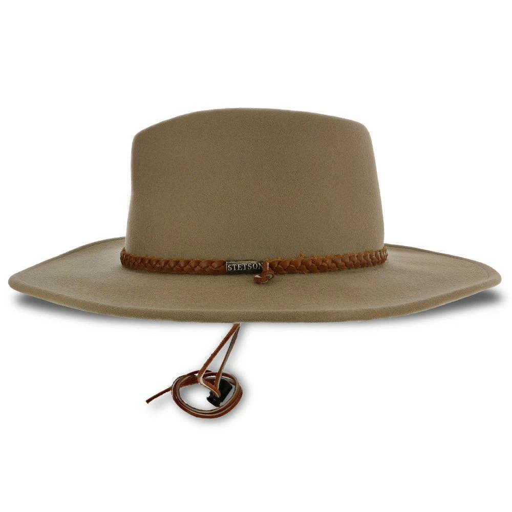 The rugged outdoors is the first thing you think of when you see the Sagebrush Felt Cowboy Hat from Stetson. This hat has a wide brim adorned with braded leather and a wind cord designed to keep it firmly on your head as you horseback ride along a mountain river or hike to the top of a waterfall.